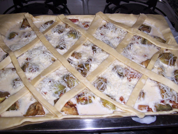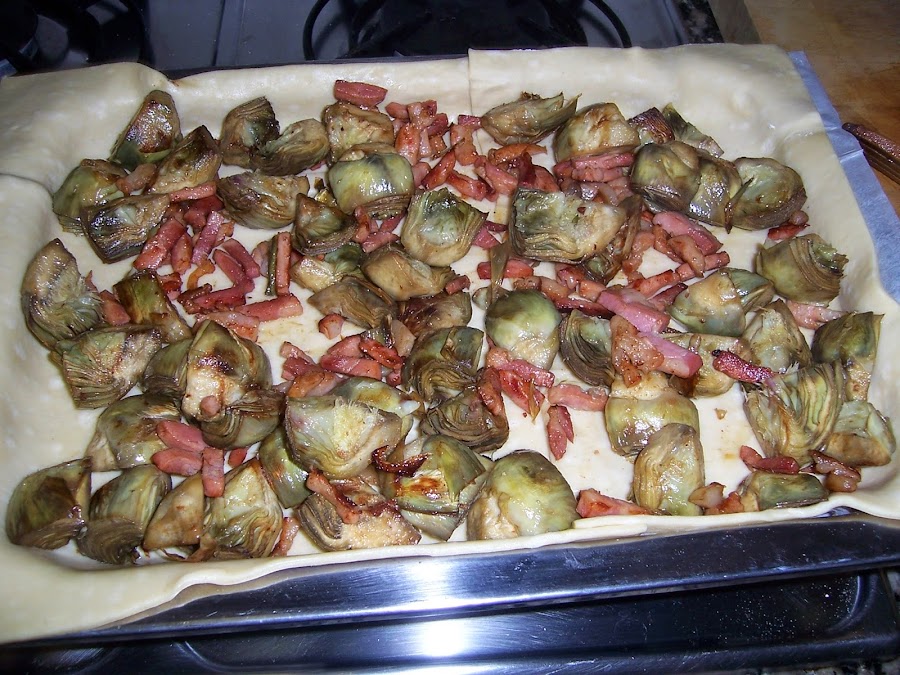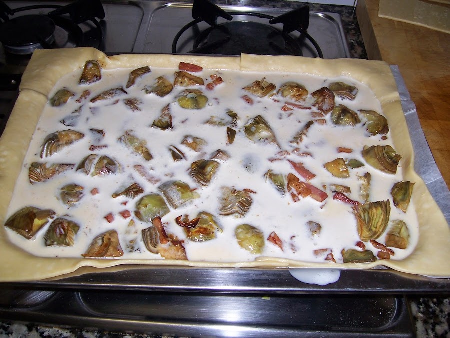 Extendemos la masa sobre la bandeja del horno y añadimos las alcachofas con el bacón y la cubrimos con la mezcla de leche y huevo.