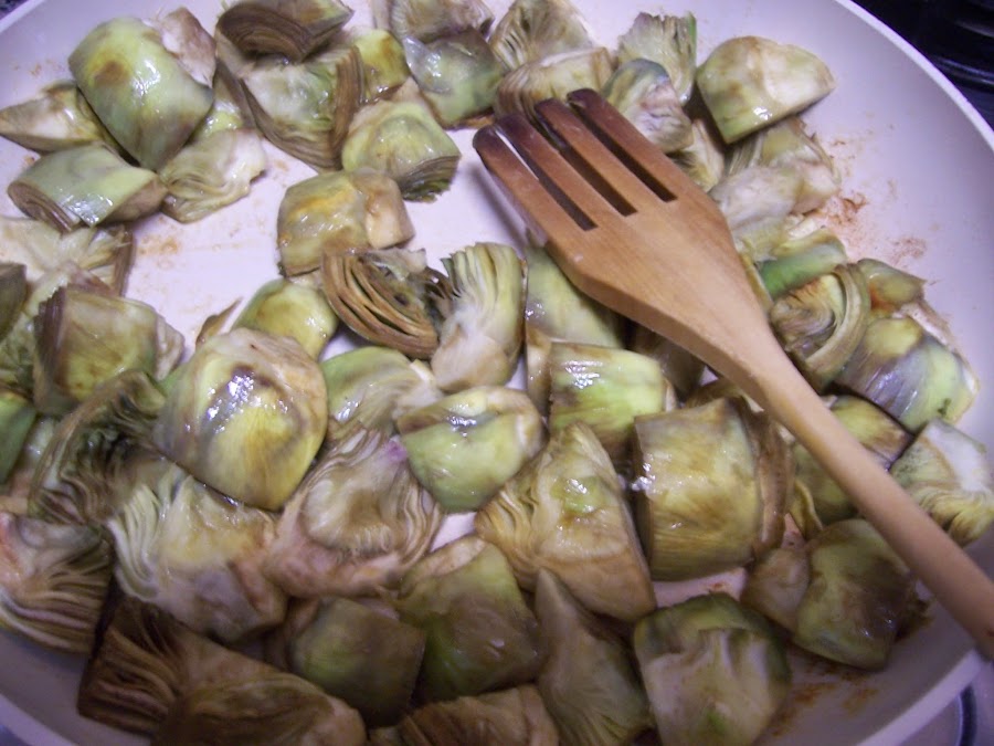 Cortamos los corazones en cuatro trozos y los rehogamos con un chorrito de aceite de oliva, la cucharadita de mantequilla y sal unos 5 minutos.