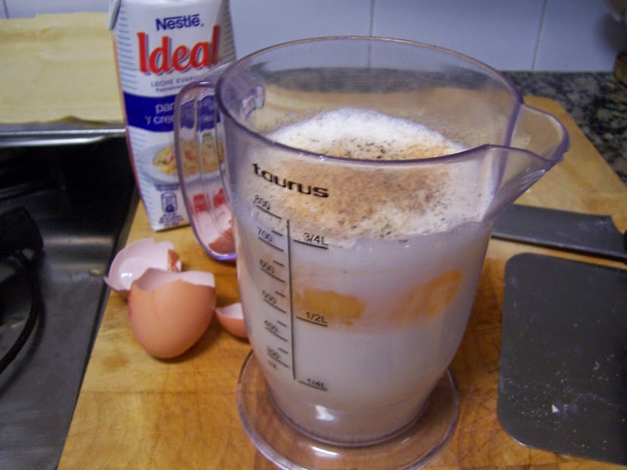 Mientras, preparamos la mezcla con la leche o nata (crema de leche), los huevos, 1/2 cucharadita de sal, un pellizco de pimienta negra y otro de nuez moscada si son recién molidos mejor. Batimos bien la mezcla y apartamos.