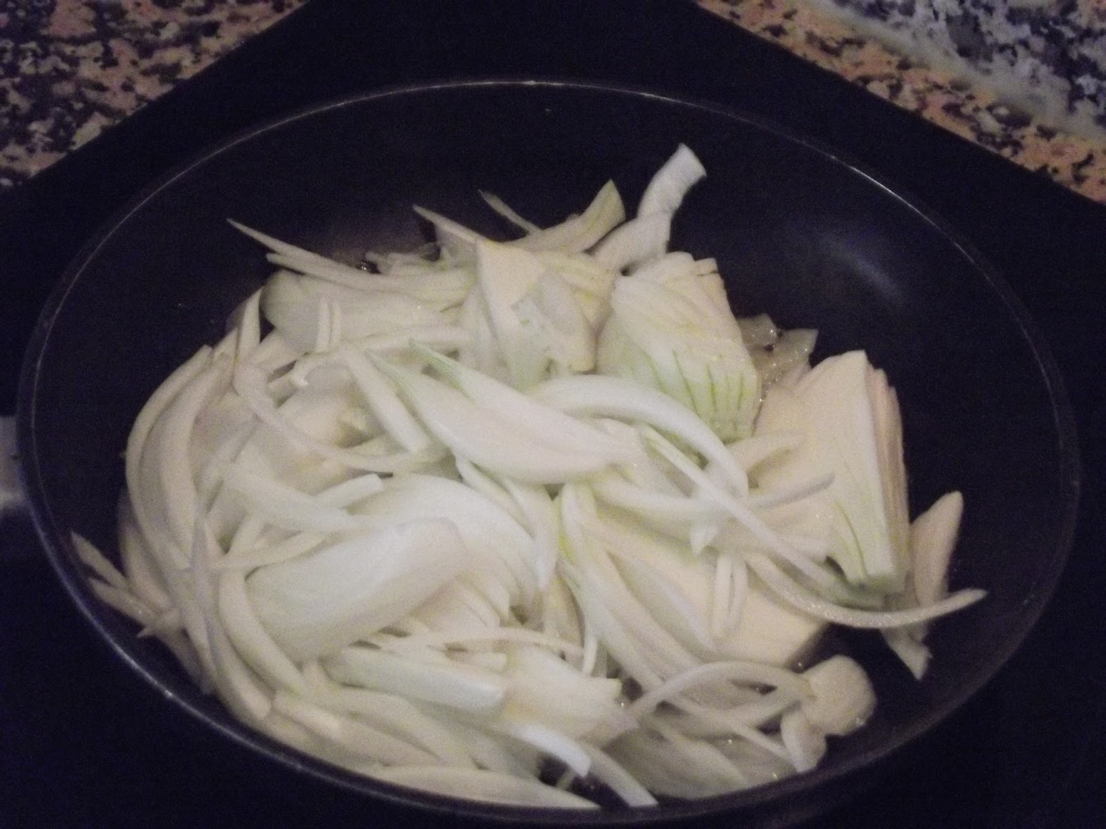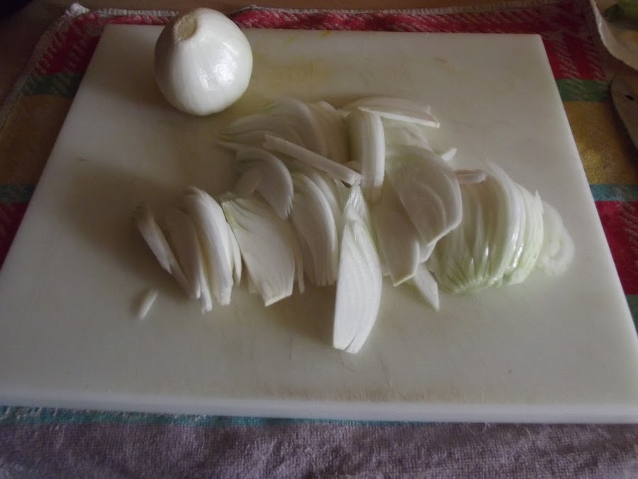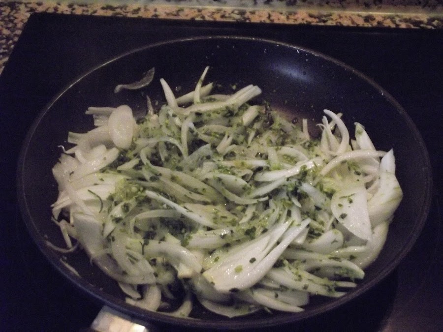 En una sartén, poner 2 cucharadas de aceite y poner a pochar a fuego medio dos cebolletas cortadas en juliana (tiras) y pochar durante unos 20 minutos aproximadamente.