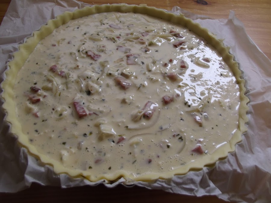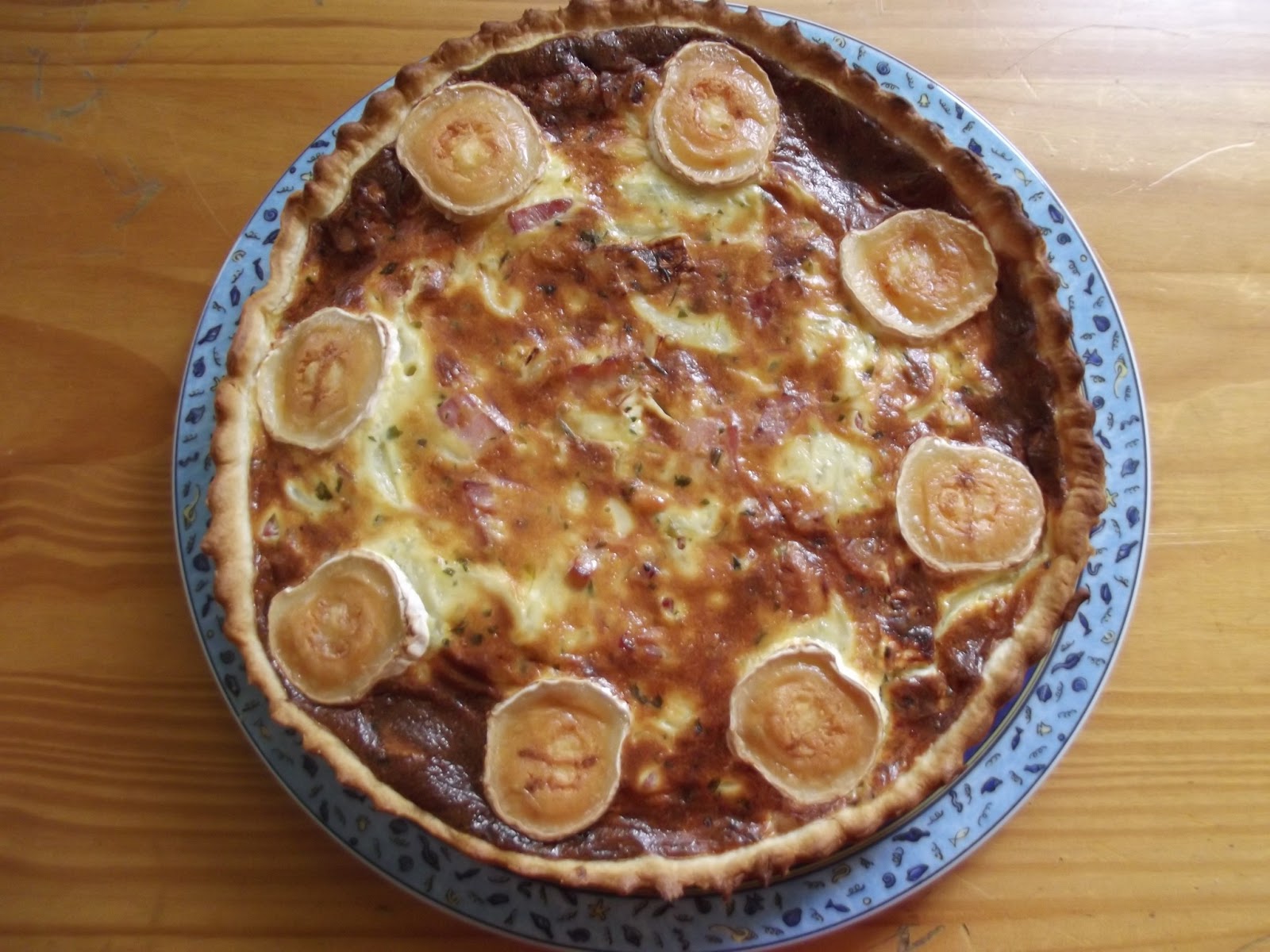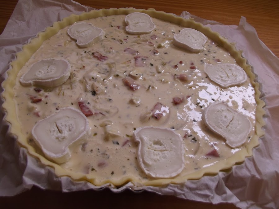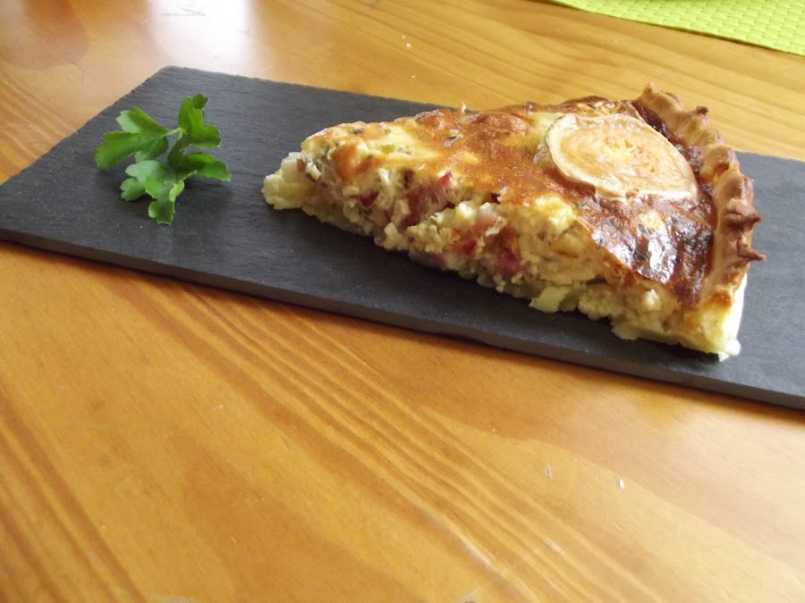 Otra idea para un quiché, de las muchísimas que hay, es esta combinación de ingredientes...bacon, cebolla y queso de cabra.