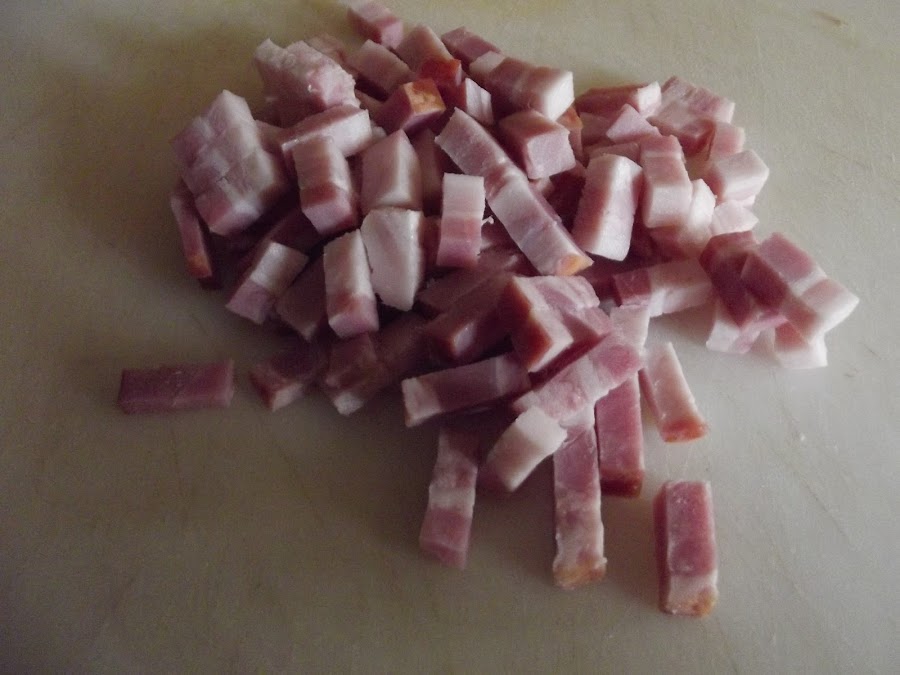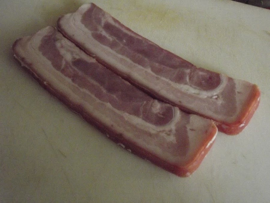 - 2 lonchas de 2 cm de bacon ahumado