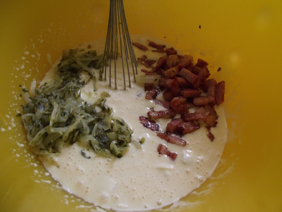 Ahora batir en un cuenco los 3 huevos, añadir el vaso de nata (crema de leche) líquida, las dos cucharadas de queso rayado enmental, la cebolleta y el bacon y mezclar.