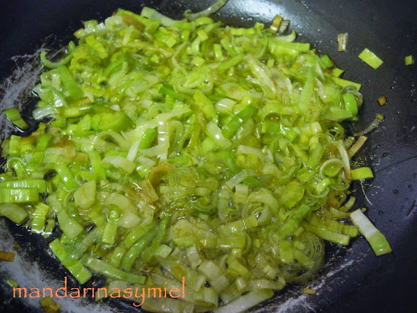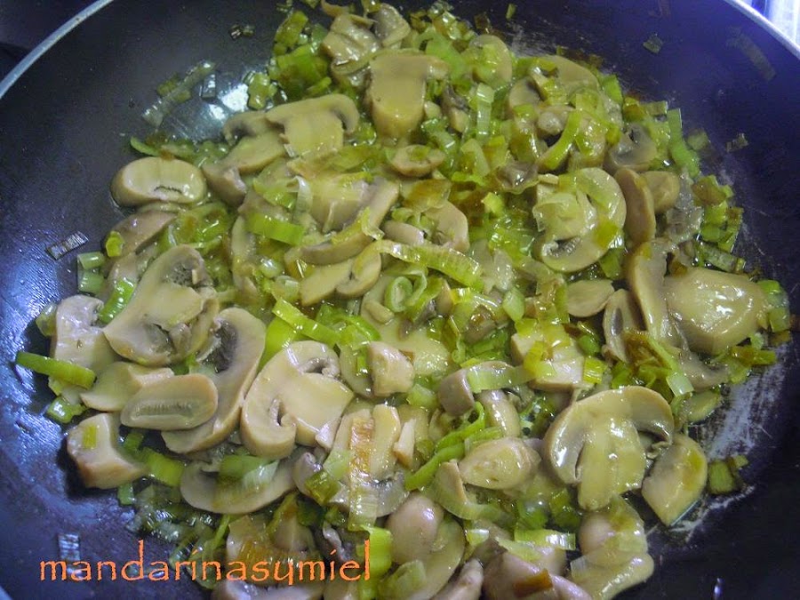 En una sartén al fuego, pon un poco de aceite y pocha el puerro, cuando haya tomado color, pon los champiñones y deja que se cocinen unos 5 minutos. Cuando estén, saca las verduras y reserva.