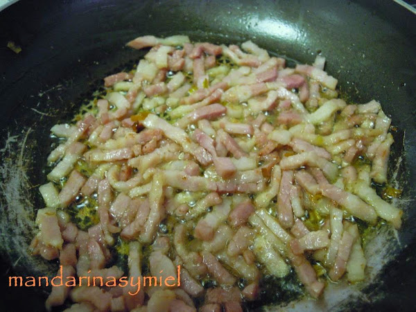 En el mismo aceite, sofríe el bacon hasta que esté algo doradito, saca y pásalo por un colador para que pierda aceite.