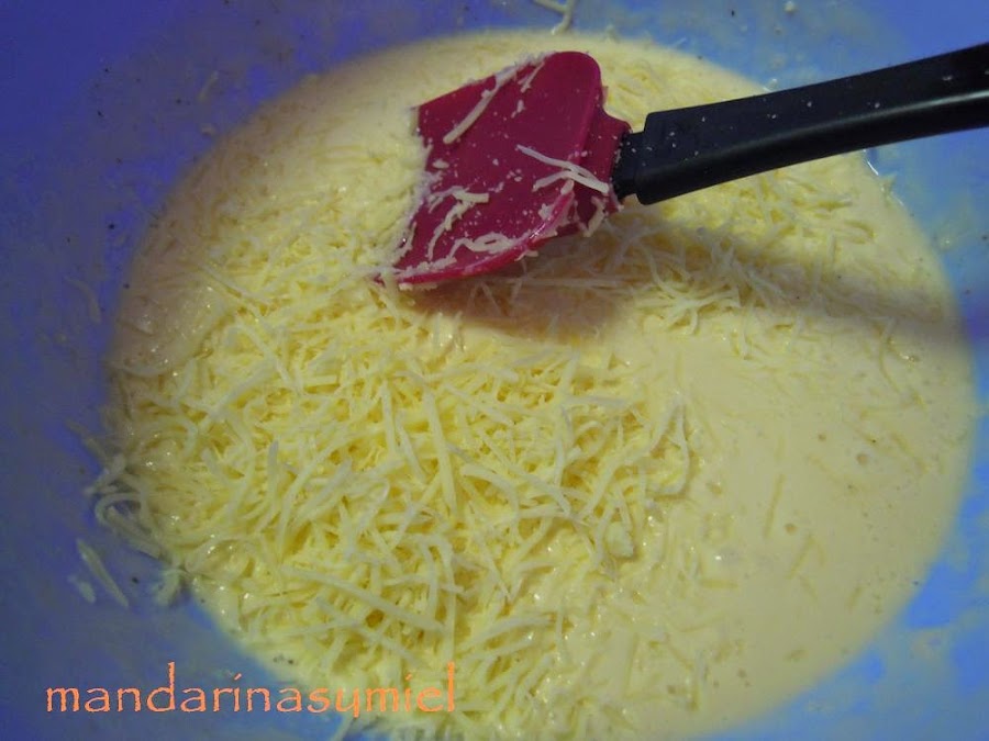 En un bol, bate los huevos, añade la nata (crema de leche), el queso, la sal y un poco de pimienta, mezcla todo bien.