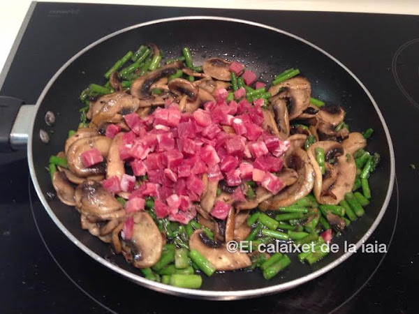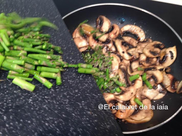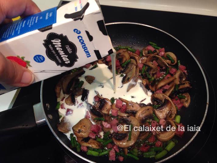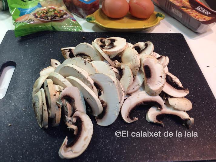 Sacamos el rollo de masa del frigo para que coja temperatura ambiente. Limpiamos y laminamos los champiñones y los ponemos a freir en un sartén con aceite