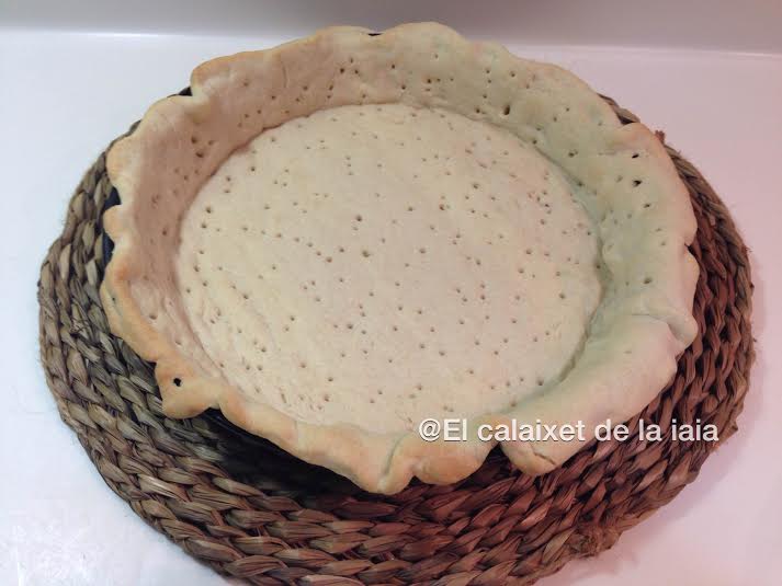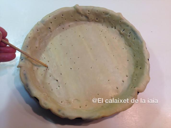 Mientras tanto colocamos el rollo de masa sobre un molde y pinchamos con un objeto no punzante para que no suba al meterla en el horno, donde introduciremos y tendremos a 180º unos DIEZ minutos