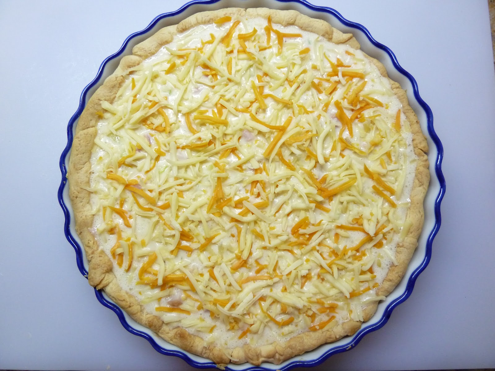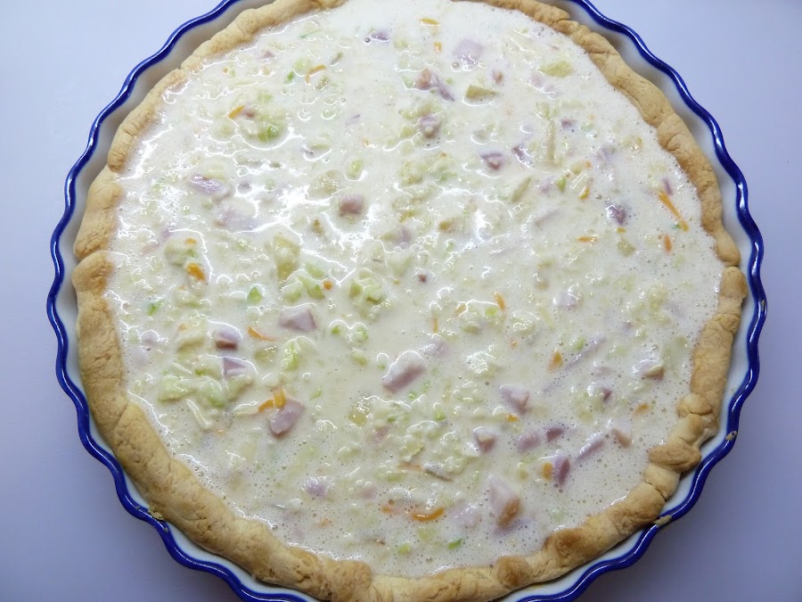 5) Añadir a la mezcla anterior: el beicon troceado + calabación cortado finito + cebolla, y verter todo sobre la masa quebrada horneada.