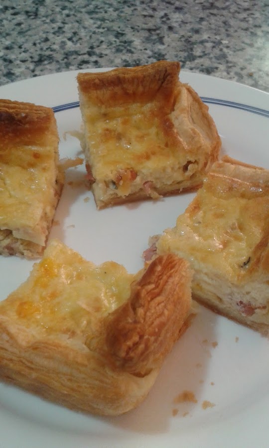 Mezclamos el huevo y nata (crema de leche) con el beicon con cebolla, lo echamos en la masa de hojaldre espolvoreamos con el queso rallado, se hornea durante 20 min. a 180 grados.