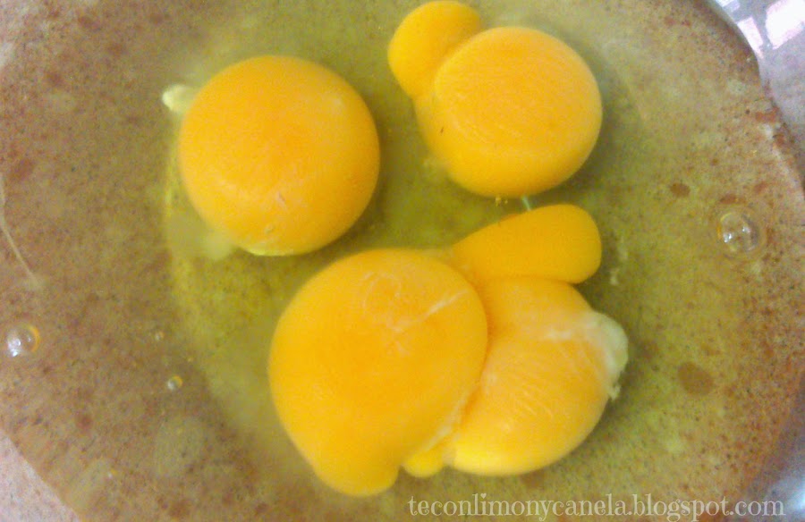 Batimos los huevos. Aunque esté fea la foto, os la enseño porque el tercero que abrí traía dos yemas... ¿A que hace ilusión que salga así?