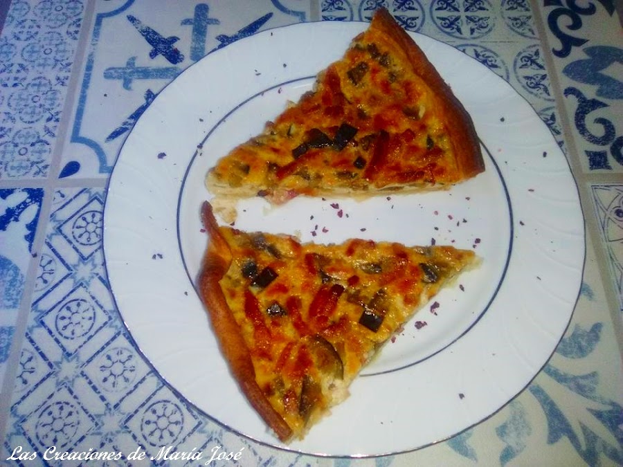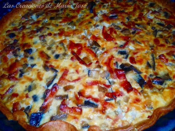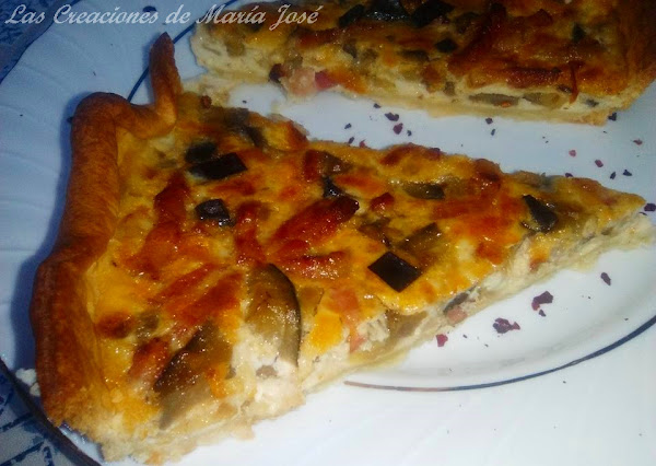 Colocamos la masa quebrada en un molde, apto para horno. Troceamos la berenjena en trozos muy pequeños. En una sartén con un poco de aceite salteamos la berenjena y el bacon juntos, reservamos.