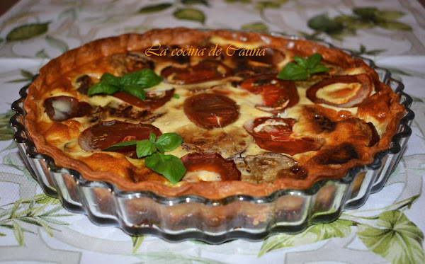 Colocamos encima los tomates cortados en rodajas finas y horneamos mas o menos unos 40 minutos hasta que el relleno este cuajado.