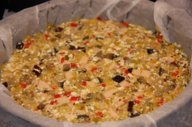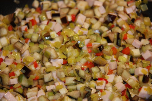 , después añadimos la berenjena, pavo,especias y requesón,mezclamos.