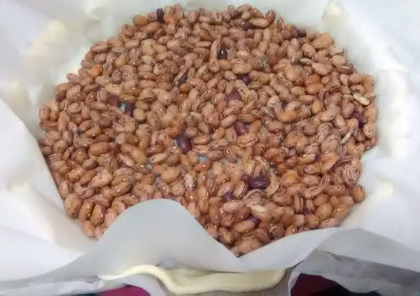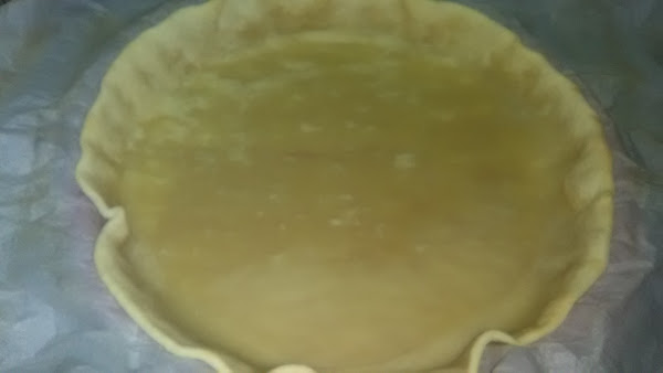 Precalentamos el horno a 200 ºC durante 10 minutos. Introducimos el molde en el horno y horneamos unos 15 minutos a 200ºC. Sacamos del horno para retirar las alubias y el papel vegetal que estaba justo debajo de ellas.