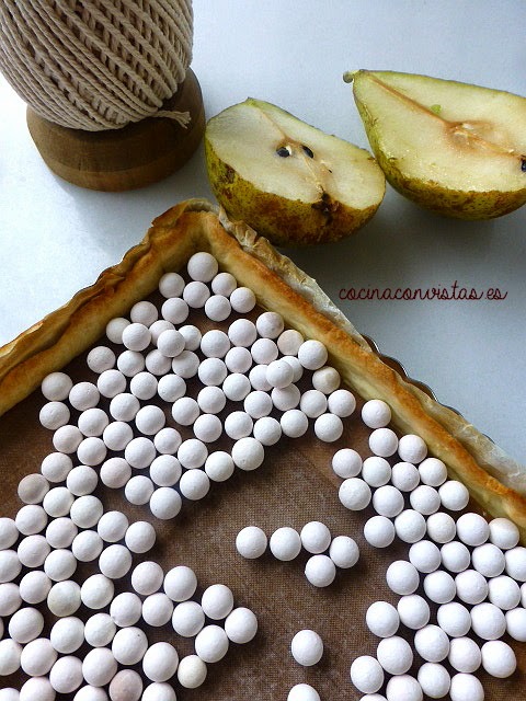 Dejamos enfriar un poco la masa antes de retirarle el peso (he utilizado bolitas de cerámica, pero podemos usar legumbres) y verter en ella la mezcla de huevos, leche, pera, boletus y espárragos.