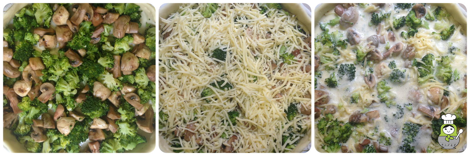 Colocamos los champiñones y el brócoli bien seco sobre la masa quebrada. Agregamos el queso rallado y removemos todos los ingredientes con cuidado ayudándonos de una cuchara.