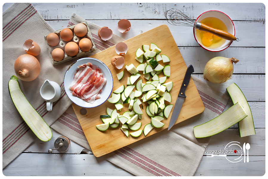 Añadir a la sartén, salpimentar y dejar a fuego suave hasta que el calabacín esté al dente.