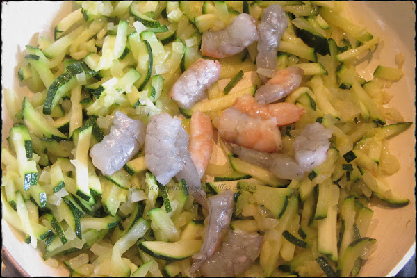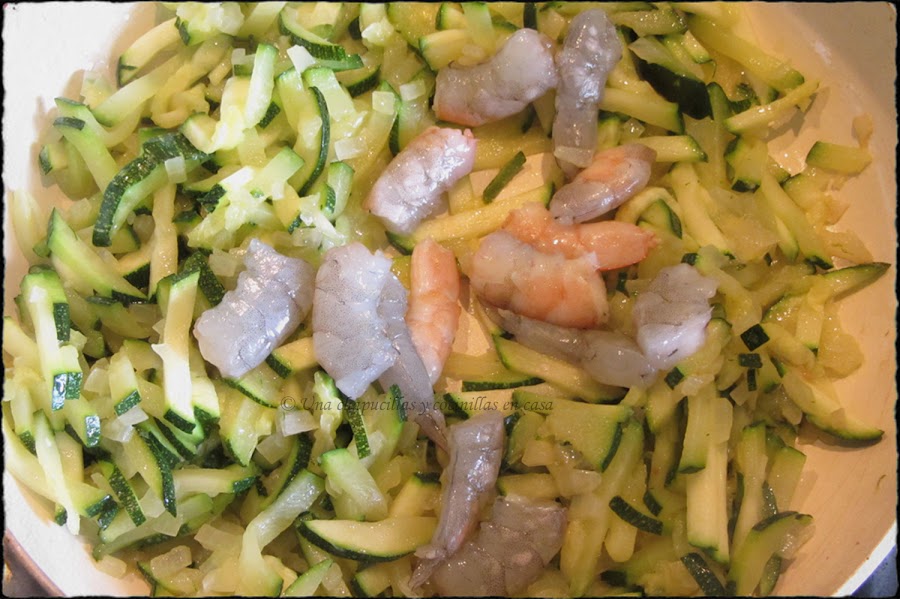 Cuando ya le cebolla esta transparente y el calabacin ha ablandado, incorporar los langostinos pelados y cortados por la mitad. Salpimentar.