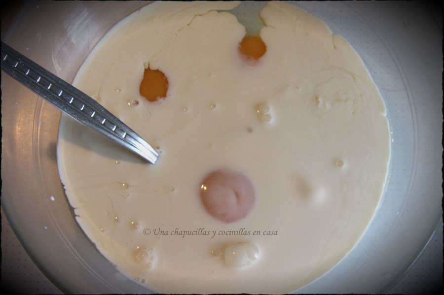 Mientras se saltean, echar en un bol los tres huevos, la nata (crema de leche) y la mozzarella. Añadir un poco de sal, pimienta y nuez moscada (opcional). Batir todo bien.