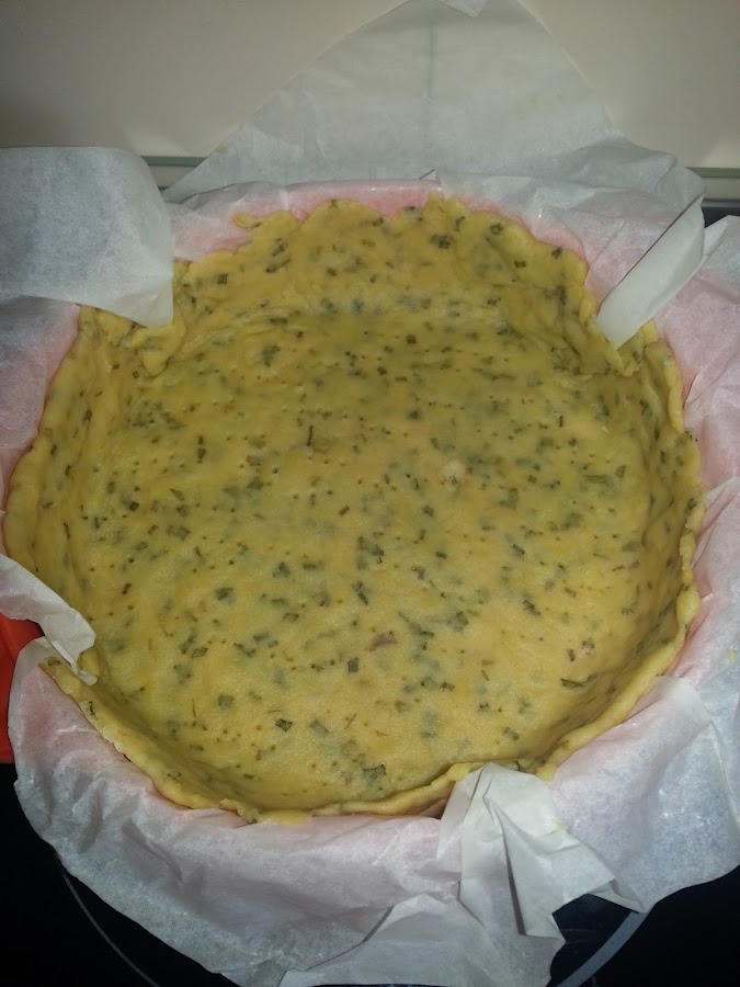 Bueno ahora vamos a realizar la masa; en un bol vamos a poner la harina mezclada con un poco de cebollino y un poco de sal, y haremos con ella un pequeño volcán en el cual pondremos el huevo, y lo mezclamos todo bien hasta obtener una masa como la de la pizza. En la encimera la vamos a enharinar y vamos a estirar en ella la masa con un rodillo para que quede bien fina, la ponemos en una fuente especial para la quiché o en un molde para bizcocho si no tenemos el otro.
