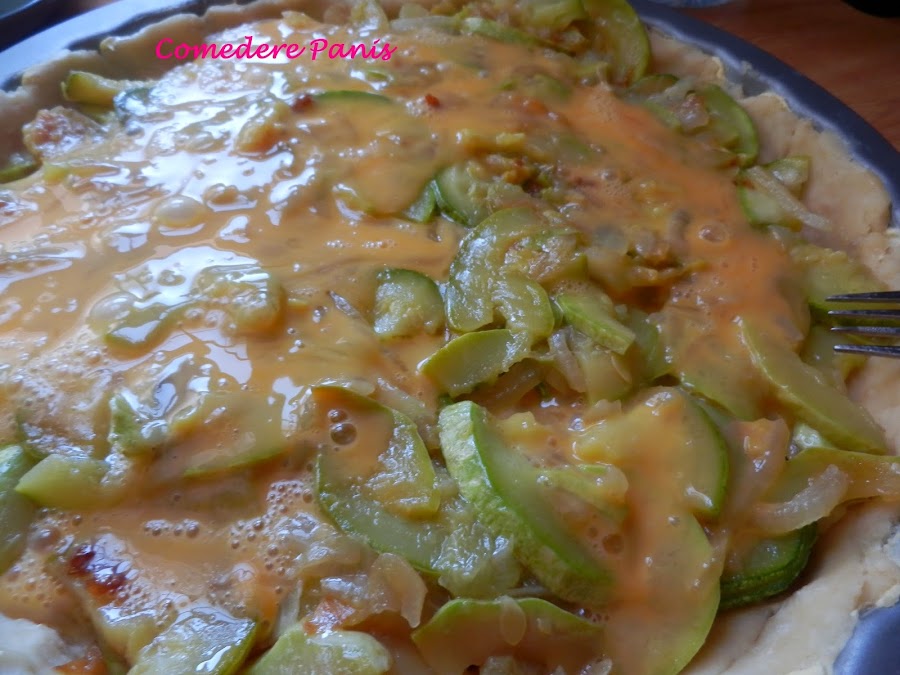 Cuando saques el molde de la nevera pon sobre la masa el calabacín y la cebolla. Luego bate los huevos y agrégaselos.