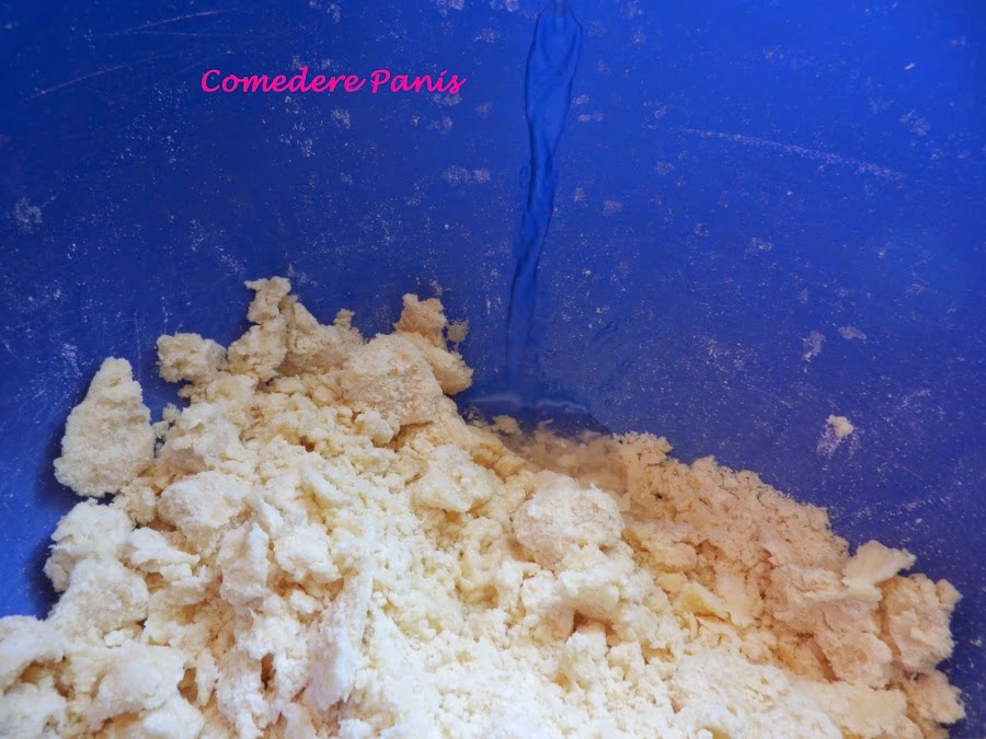 Mezclar la mantequilla, frotando con la punta de los dedos, como si diéramos unos pellizcos. Cuando notes que están bien mezclados agregas el agua y sigues apretando la masa con los dedos hasta que la masa se compacte.