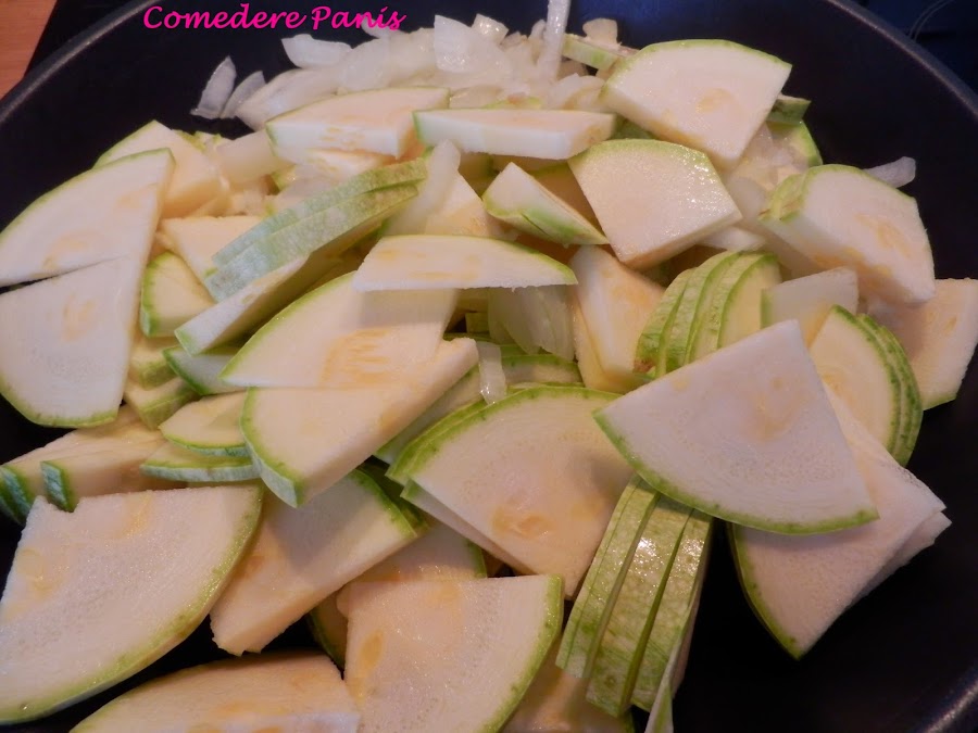 En una sartén con un chorro de aceite de oliva dorar la cebolla y el calabacín hasta que estén bien guisados.