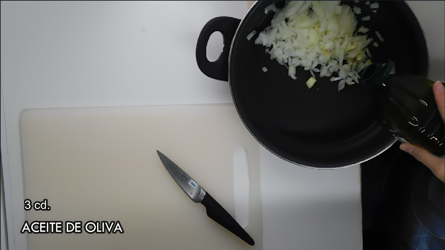 Primero picamos la cebolla en trocitos muy pequeños y la rehogamos en una sartén con tres cucharadas de aceite de oliva. Mientras esto se termina, podemos ir cortando el puerro en daditos, y una vez lista la cebolla, lo añadimos encima y lo rehogamos también.