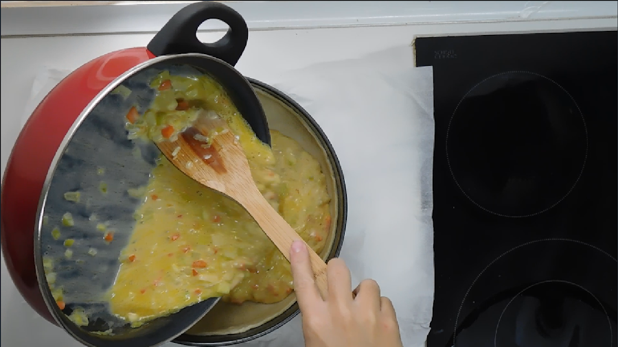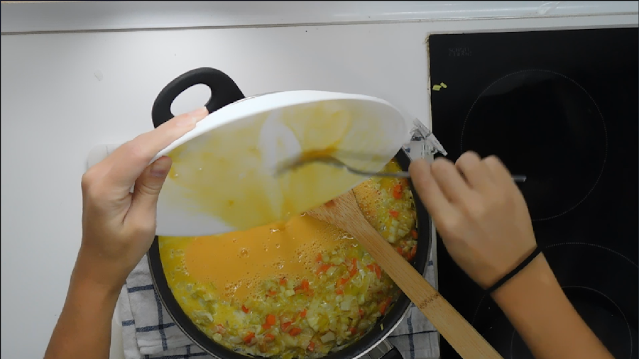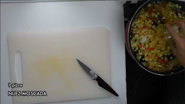 De nuevo, echamos el calabacín en la sartén y dejamos que se cocine durante unos diez minutos. Pasado este tiempo, salpimentamos a nuestro gusto y añadimos una pizca de nuez moscada. Añadimos la leche evaporada junto con los cuatro huevos previamente batidos.
