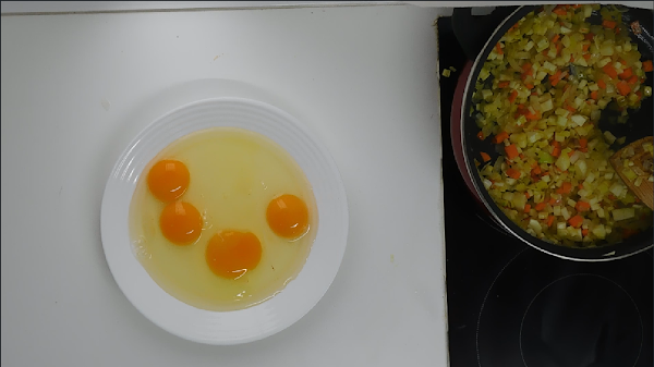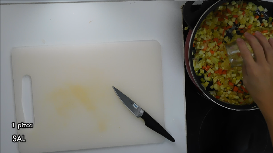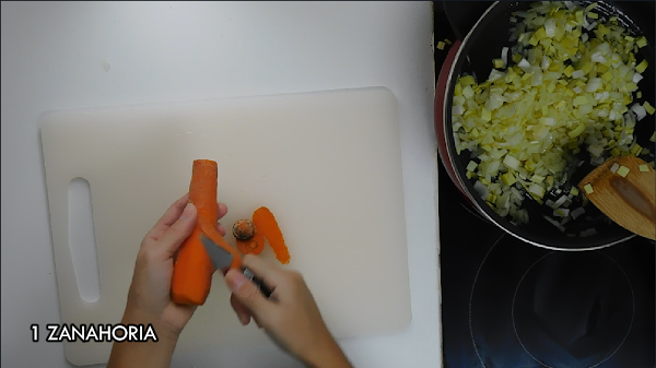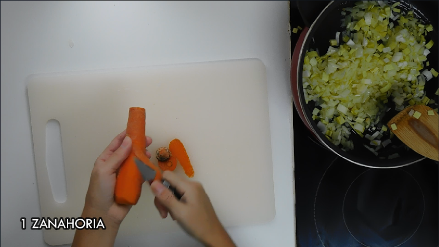 El siguiente paso será pelar y cortar la zanahoria en dados pequeños, y cuando el puerro esté tierno, añadimos la zanahoria a la sartén. Seguimos cocinando a fuego medio y pasamos a pelar y cortar el calabacín en dados también.