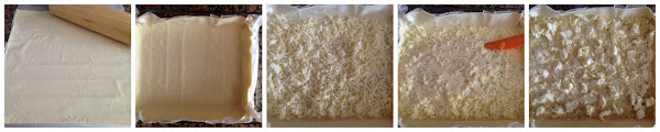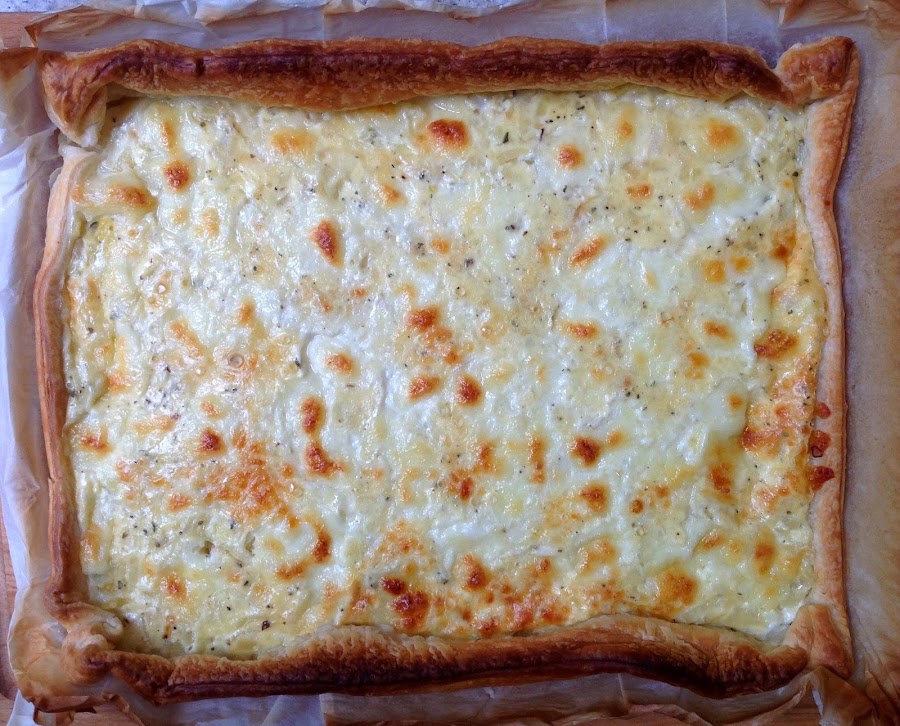 Estiramos un poco con rodillo la masa de hojaldre y la ponemos dentro de una fuente para horno, sobre papel vegetal, cubriendo bien sus paredes. Cubrimos el hojaldre con 200 gr de mozzarella rallada y volcamos encima el relleno de cebolla, huevos y nata (crema de leche). Agregamos la mozzarella fresca troceada y cocinamos en el horno a 200º (fuego fuerte) durante 20 minutos o hasta que esté dorado el hojaldre.