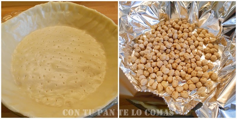 1. En el molde de horno engrasado con mantequilla o aceite, extendemos la masa quebrada. Tapamos con papel de aluminio y unos garbanzos y lo metemos al horno durante 10-15 minutos.