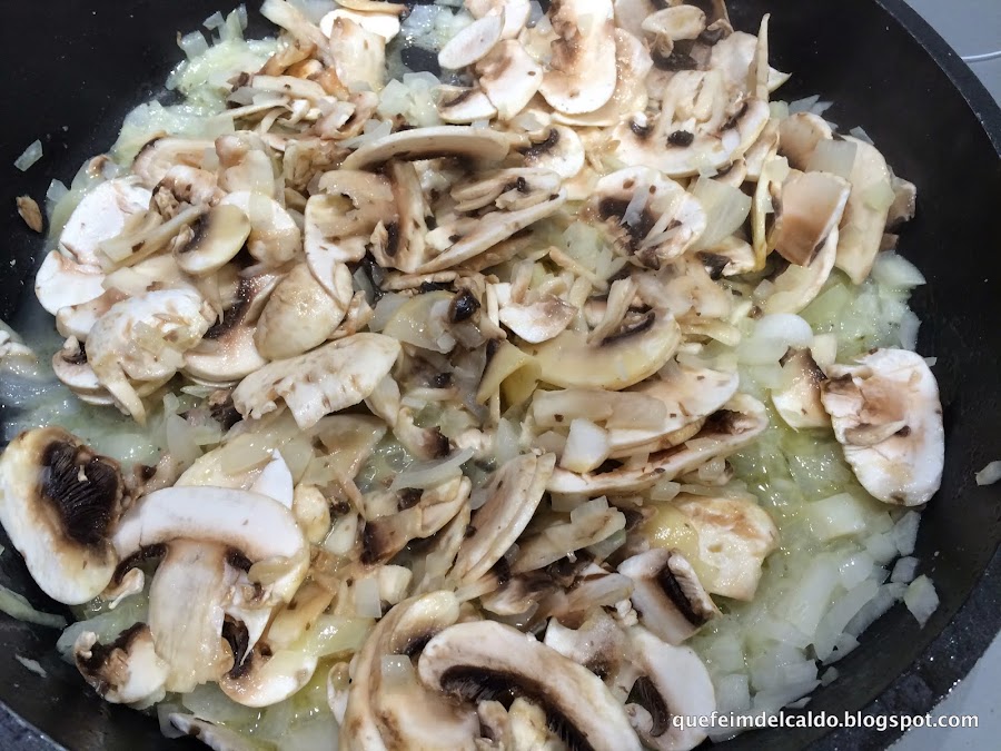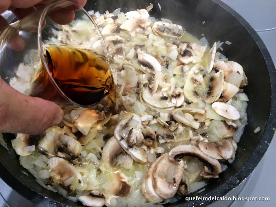Y a continuación la copita de moscatel, dejamos reducir todo el líquido durante aproximadamente 8 ó 10 minutos, no tiene que quedar nada de líquido y los champiñones se tienen que empezar a dorar.