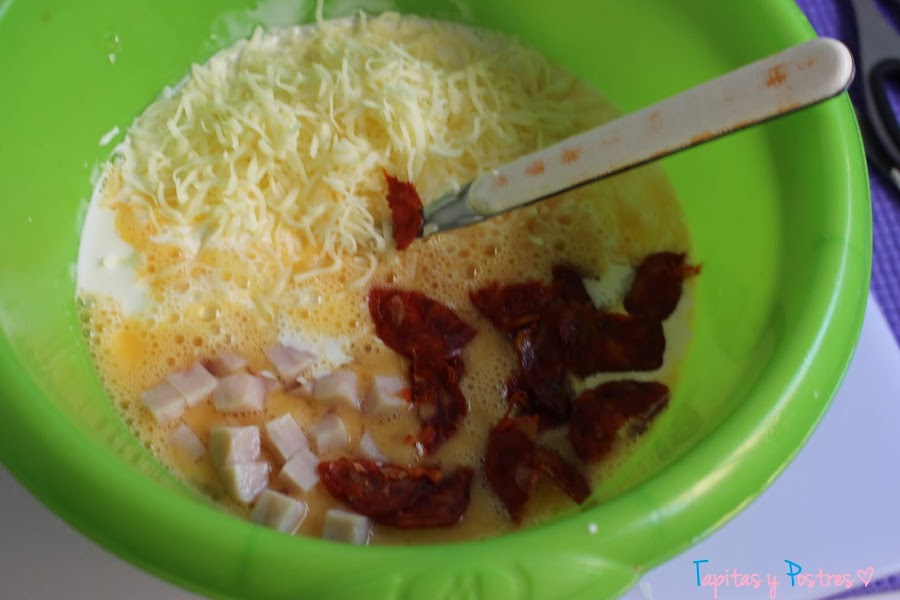En un recipiente ponemos los huevos, la nata (crema de leche), el jamón, el chorizo, la mitad del queso y las al y pimienta. Removemos bien.