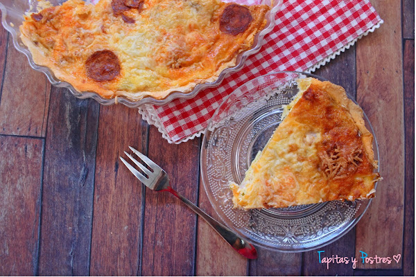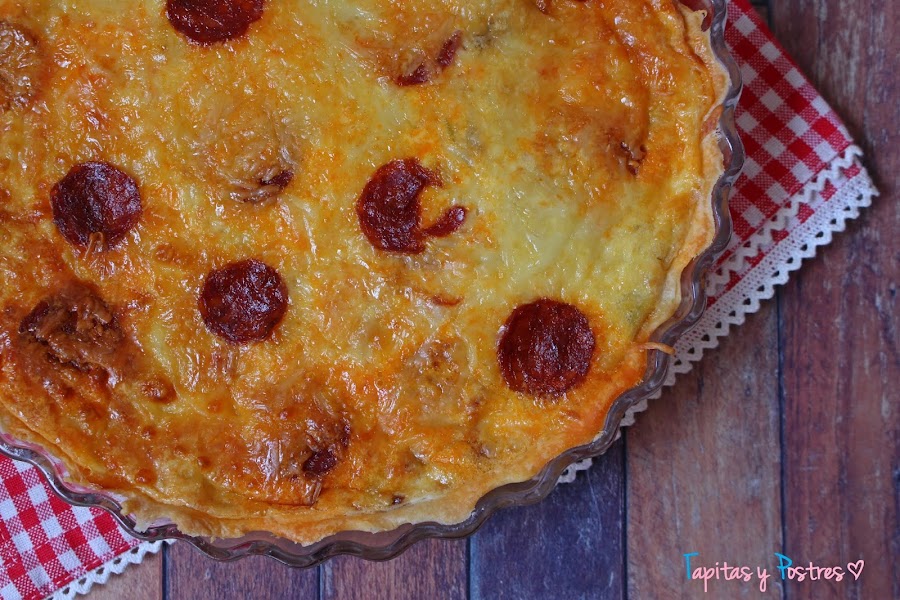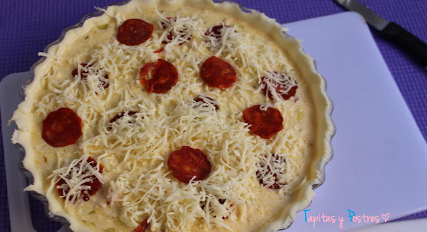 Extendemos la masa quebrada sobre un molde de tarta o quiche que habremos engrasado. Pinchamos el fondo y vertemos la masa en ella. Echamos el resto del queso rallado encima y colocamos algunas rodajas de chorizo.