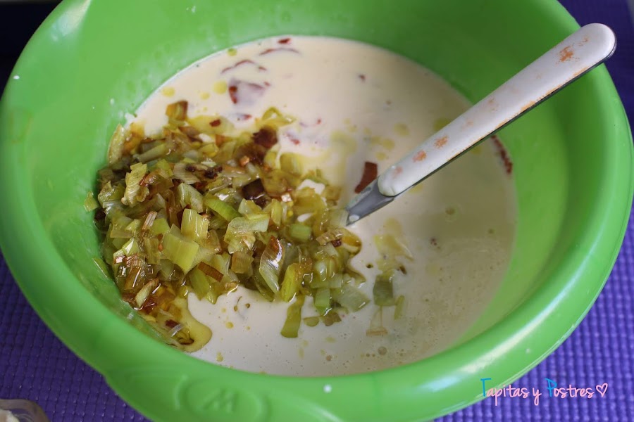 Removemos todo bien para que se integre, y agregamos el puerro y el ajo pochados. Volvemos a batir hasta que tengamos una masa líquida.
