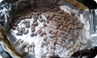 Introdúcela en el congelador para que cuando la hornees no encoja. Mientras precalentamos el horno , calor arriba y abajo 180º. Mete la masa en el horno , no sin antes poner encima un papel de plata encima y algo de peso.