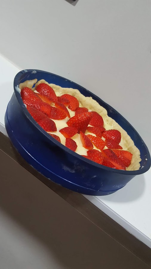 7.- Cuando se haya enfriado la masa, añadimos la crema pastelera y la adornamos con las fresas o frutos rojos (dependiendo de lo que encontréis en temporada)