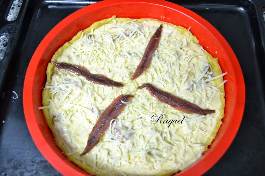 Lo volcamos por encima de la masa y ponemos por encima el queso rallado y las anchoas adornando por encima.