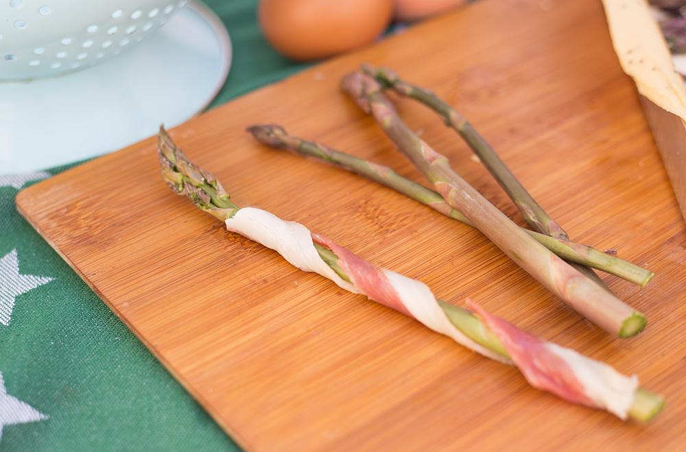 Para el montaje del quiché, vamos a ir poniendo los ingredientes sobre la masa quebrada que ya habremos horneado. Comencemos repartiendo la cebolla caramelizada y las ciruelas sin hueso troceadas. En un bol batir los huevos junto con la nata (crema de leche) junto con un pellizco de sal y un pellizco de romero seco e incorporar también al molde. Ahora tendremos que preparar los espárragos, lavar y cortar el tallo inferior. Nosotras siempre lo doblamos con las manos hasta que se rompe solo, así evitaremos usar parte que tienen mucha fibra y no podremos masticar. Para la decoración cortaremos el jamón serrano en tiras a lo largo y las enrollamos sobre el espárrago, repetir este proceso con todos los espárragos.