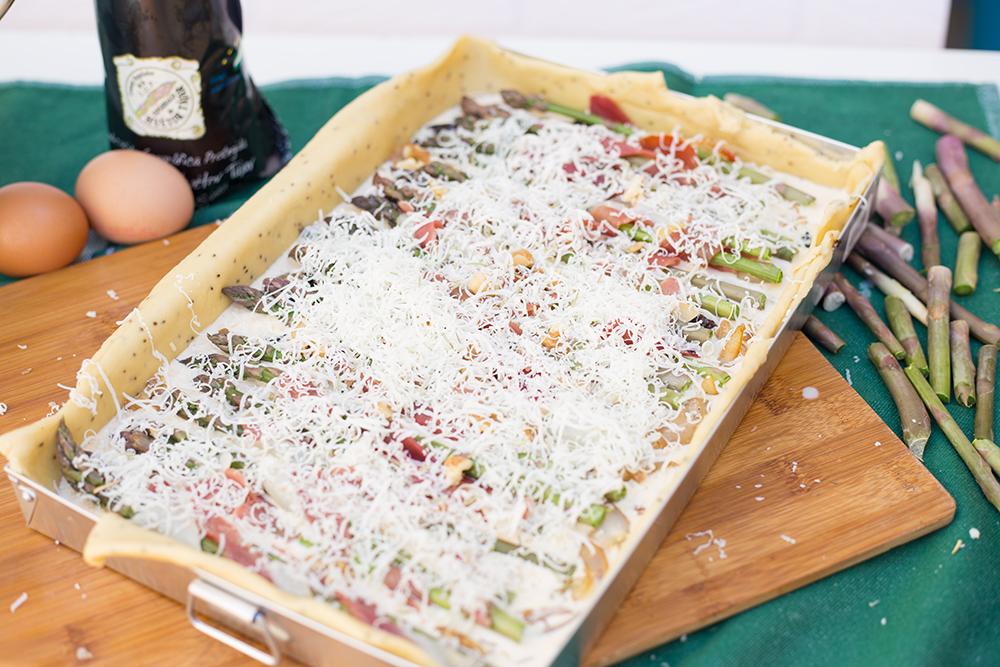 Una vez hayamos acabado de enrollar el jamón sobre los espárragos los colocaremos todos mirando hacia el mismo sitio sobre el huevo batido con nata (crema de leche). No presionar mucho para que no se hundan y desaparezcan. Ya está casi listo, tan solo nos queda repartir las nueces troceadas y rallar el queso que más nos guste.