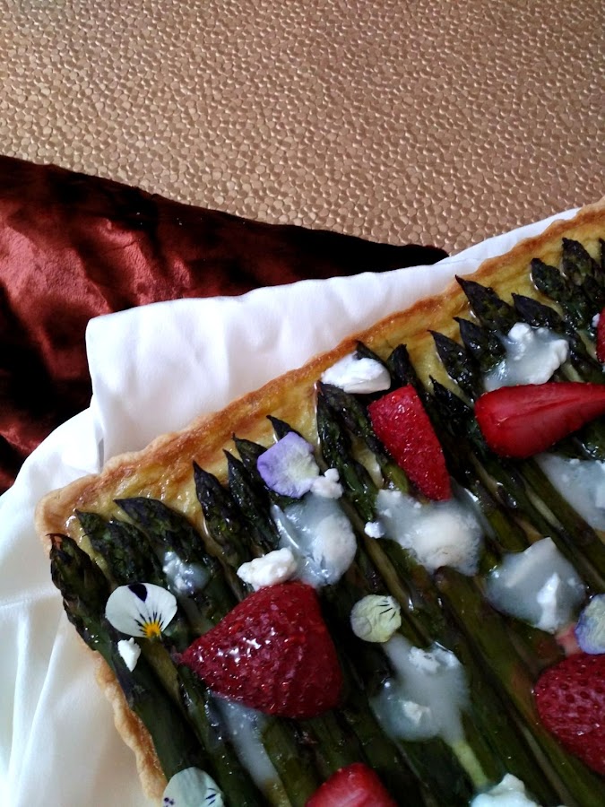 Pasado ese tiempo retiramos del horno y colocamos los espárragos uno junto a otro por todo el molde. Coronamos con unos fresones cortados a la mitad o en cuartos y volvemos a meter al horno otros 15 minutos.
