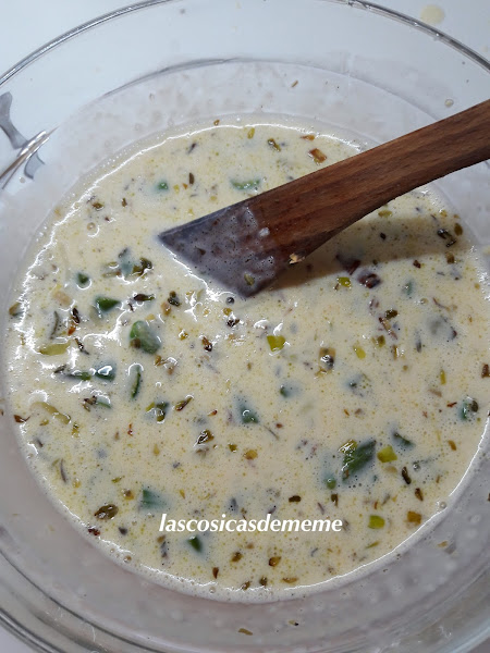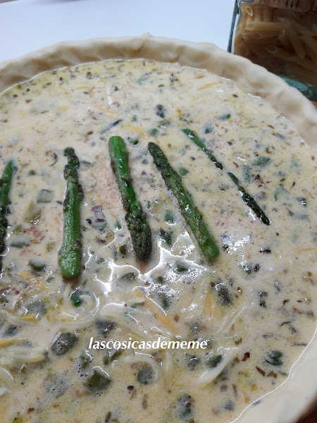 En un bol, batimos los huevos con las especias, la nata (crema de leche), el queso rallado, añadimos los espárragos bien