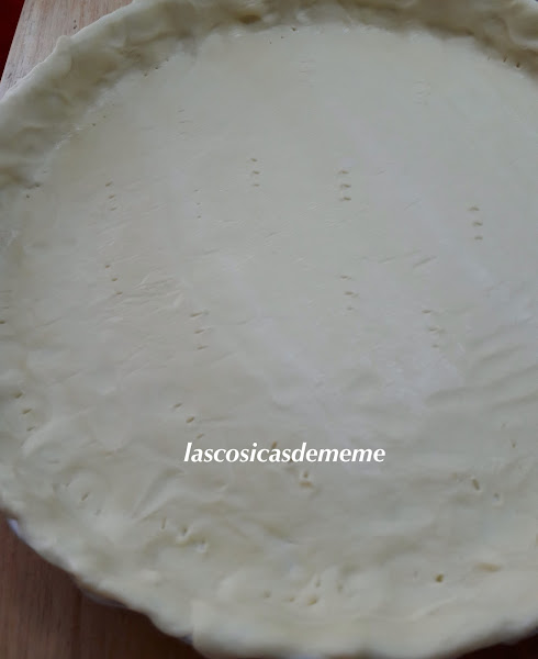 Forramos un molde de unos 22-24 centímetros con la masa, pinchamos el fondo, ponemos papel de horno, encima ponemos unos garbanzos o judías para que hagan de peso y al hornear no suba la masa. Horneamos unos 15 minutos, sacamos, quitamos el papel y las legumbres. Ya tenemos la masa preparada.
