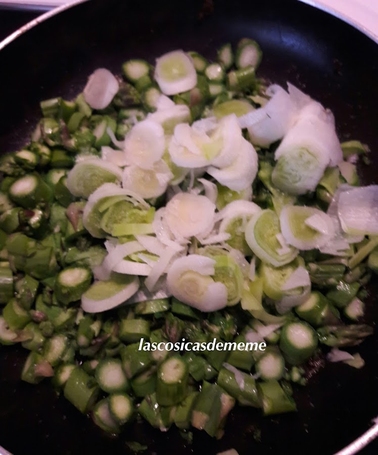 Añadimos el puerro y los espárragos troceados para que se vayan pochando, no cocinar mucho