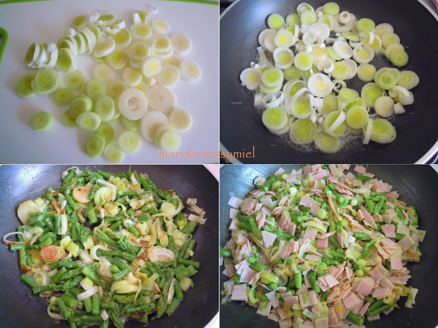 Reserva 8 espárragos enteros y trocea los demás, añádelos a la sartén con los puerros.