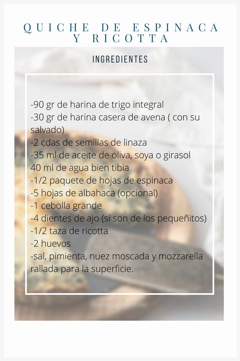 Esta receta no lleva harina blanca para la masa, sino una combinación de harina de trigo 100% integral, harina casera de avena y semillas de linaza o lino. Tampoco lleva grandes cantidades de grasa; solamente un poco de aceite de oliva o aceite de soya o girasol. El relleno no lleva crema, sino huevo batido y queso para formar esa capa dorada y fundida en la superficie. Así que tenemos una quiche mucho mas saludable, con mas fibra e infinitamente menor cantidad de grasa que las recetas tradicionales.