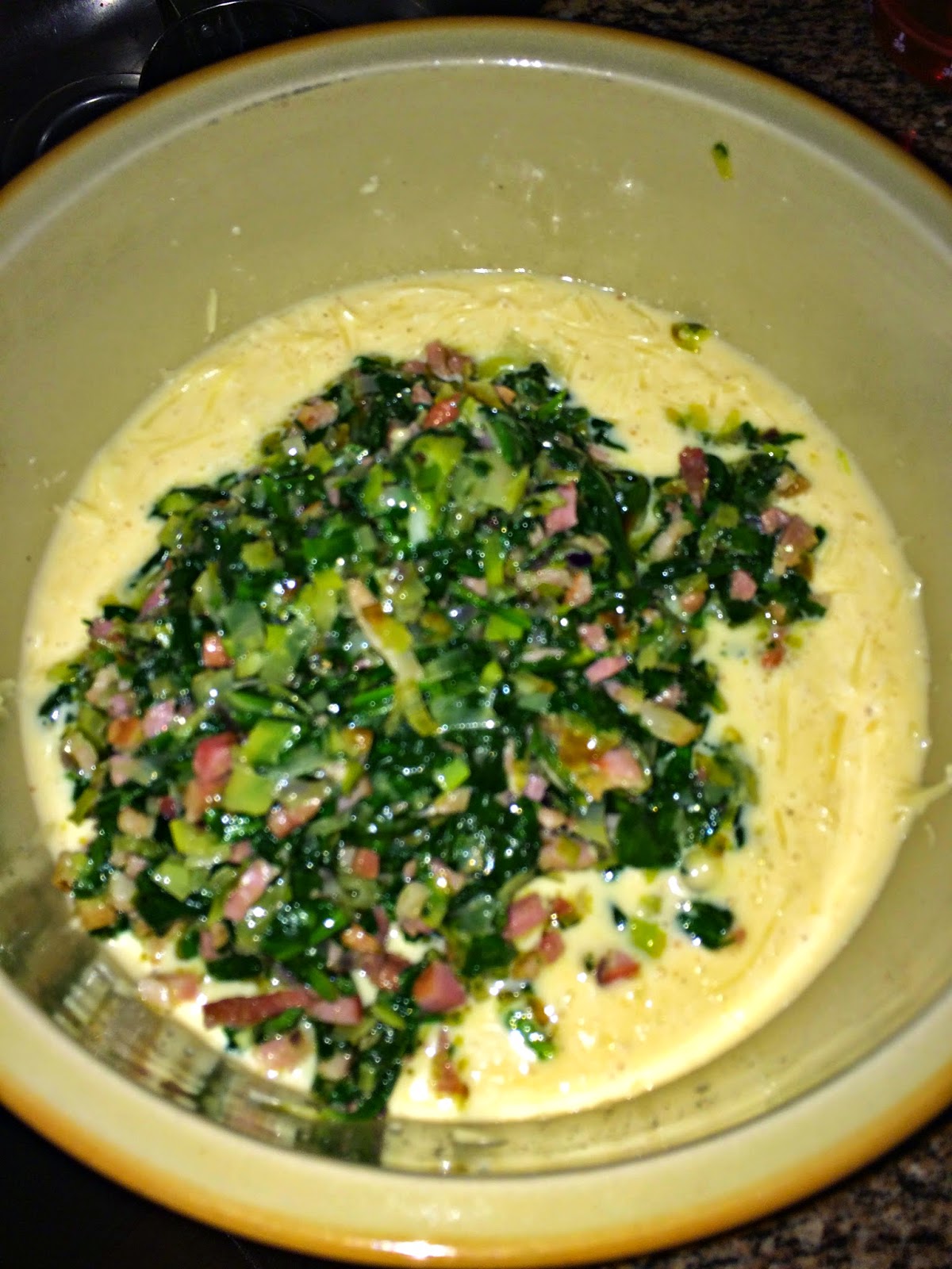 Tendremos cuidado que no se queme el bacon, solo queremos que suelte la grasa. Añadimos las espinacas, lavadas, a la cacerola, y las rehogamos unos minutos, mientras van soltando agua y se empiezan a cocinar. Veremos que perderán volumen enseguida. De momento no añadimos sal, ya que el bacon aporta mucho sabor. Tapamos la cacerola y reservamos.
