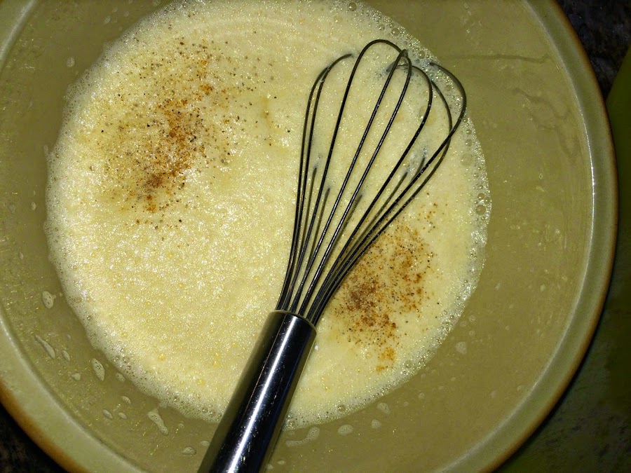 Lo batimos muy bien, que blanquee, entonces vamos a añadir la pimienta y la nuez moscada, un poco de sal y batimos para que se incorporen.